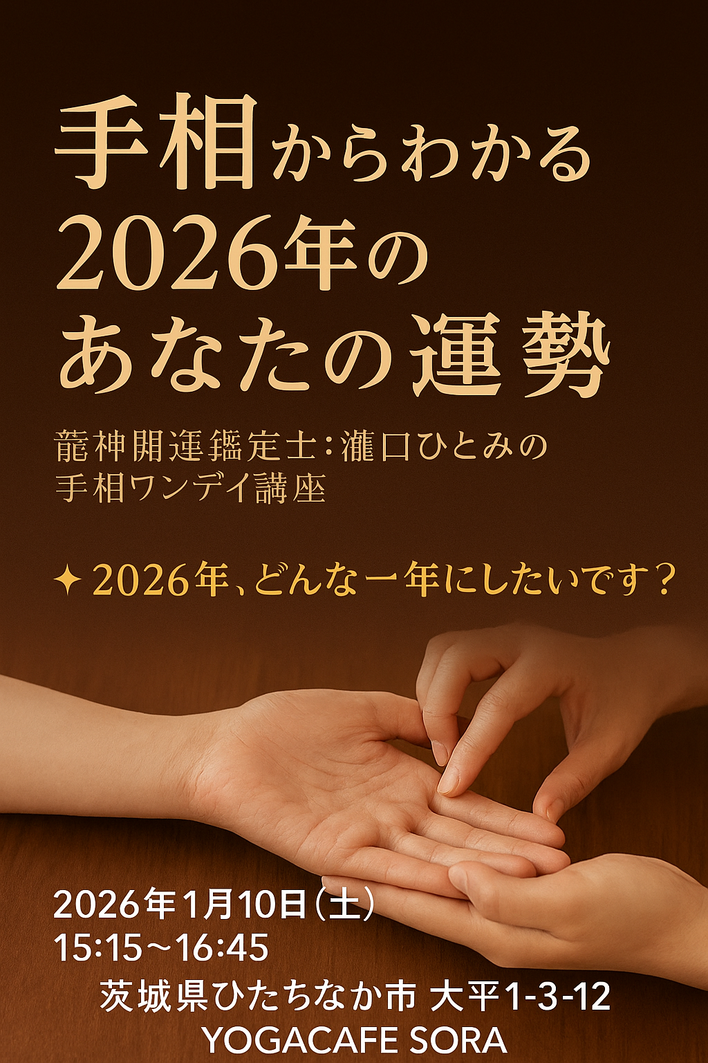 龍神開運鑑定士:瀧口ひとみの手相ワンデイ講座 日程:2026年1月10日(土)15:15〜16:45…